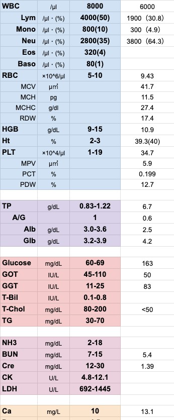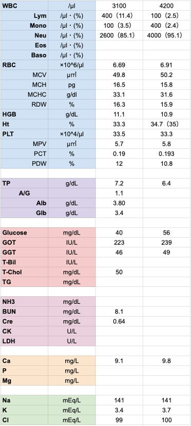 電解質バランスの大きな崩れは見られませんでしたが、吸収不良性の低Caが確認されました。餌を十分に食べられなかったようで、低血糖+GOT・GGTの増加より、重度のケトーシス状態にも陥ってしまっていることが予想されます。