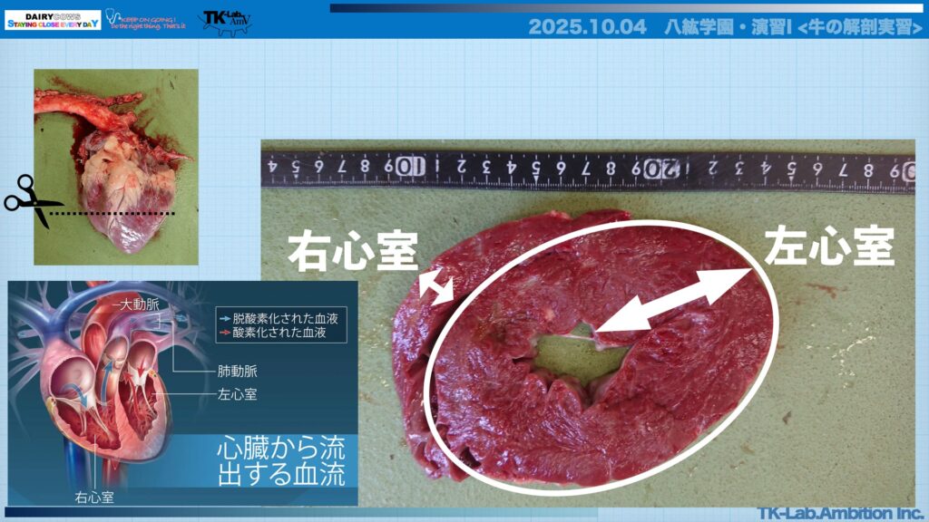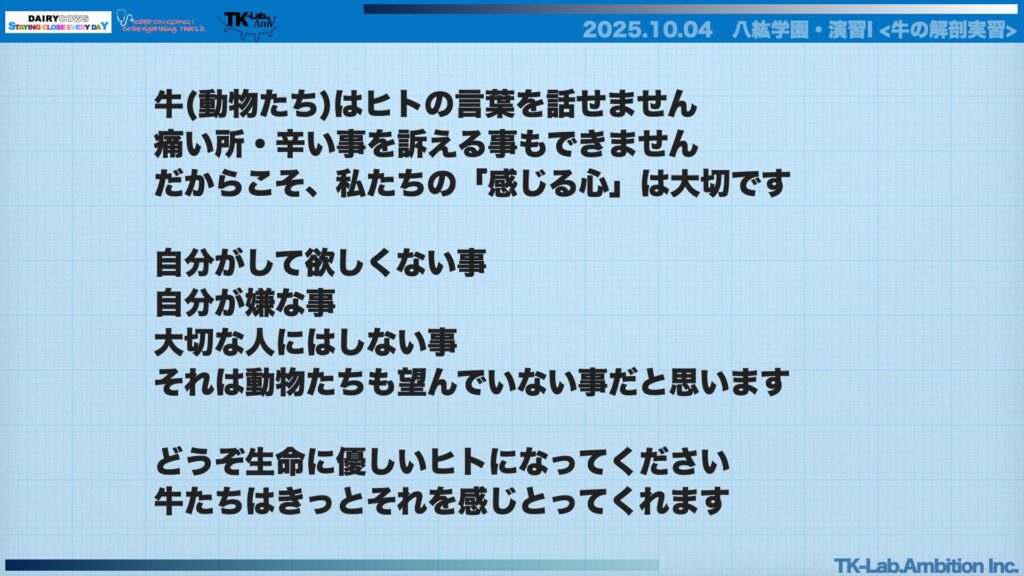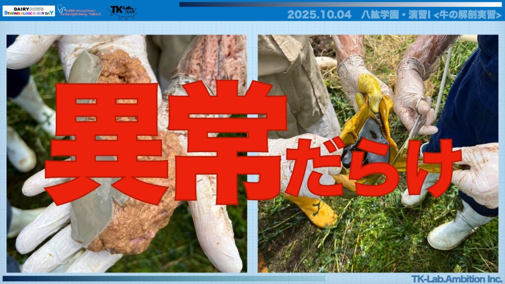 八紘学園の学生さんは全国から集い、畜産とは限らず広く農業へと携わる可能性を秘めた金の卵です。彼らには小さいことに拘るのではなく、「生命ってすごいな」「どうしてこうなるんだろう」「この状況で自分は何ができるんだろう」と言う事を感じることこそ大切だと考えます。その意味で、この実習で単なる解剖を教えるのではなく実際の病気とリンクしながら身体の中の正常と異常(病気)がどう違うのかをお伝えすること。それがTK-Lab.の目指す「解剖実習」です。