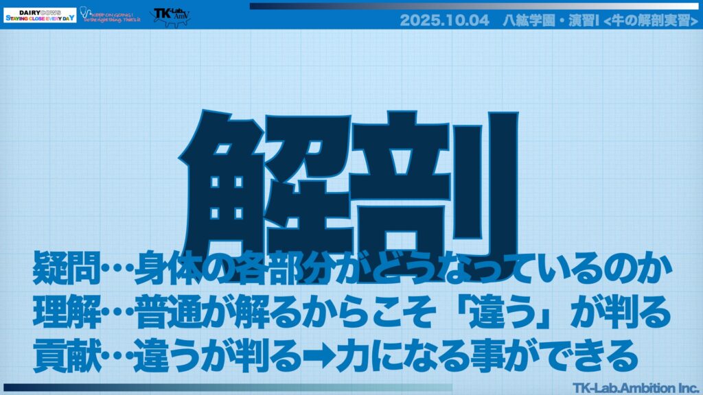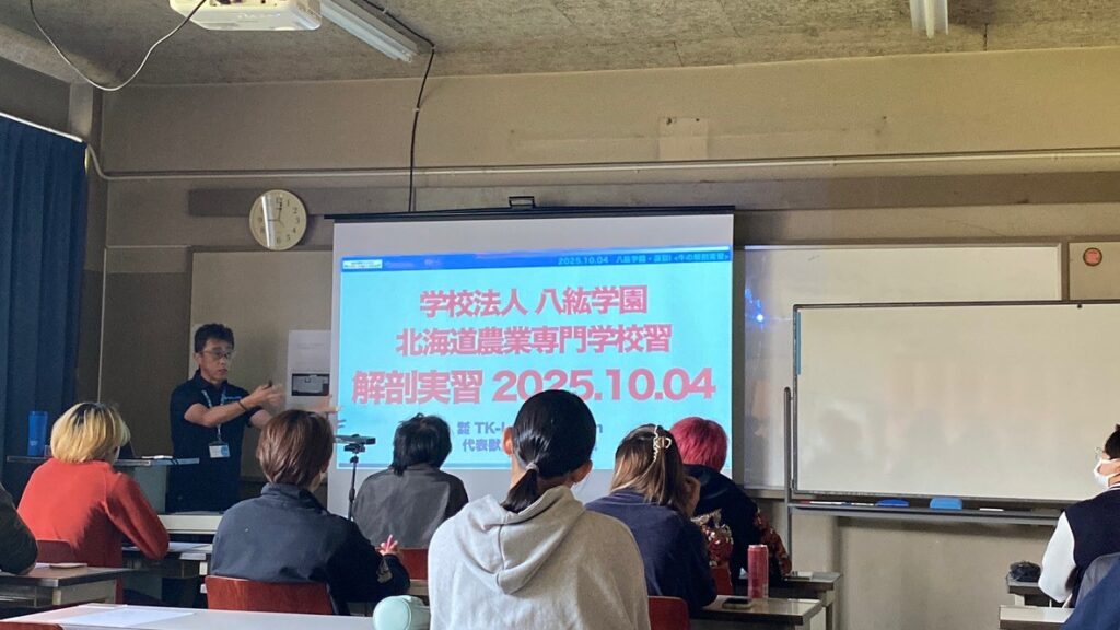 先日、『学校法人八紘学園・北海道農業専門学校』へお伺いし講義を担当させていただきました。その講義名は「解剖実習」。実習の講義? 少し皆様にもご紹介いたします。