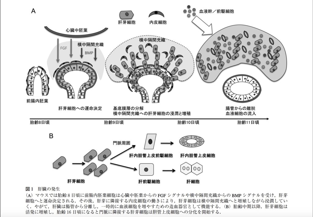 この構造を疑問に思い、肝臓の発生について調べてみたところ、マウスの肝臓の発生に関する図解が見つかりました。