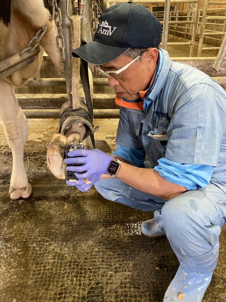 人間も同様ですが、牛の足が痛いと餌槽に向かうのもパーラーに向かうのも億劫になり、採食低下や起立困難、ストレスの増幅につながります。特に牛は立てなくなってしまうとなかなか厳しい場面が多いため、蹄は大事だな…と改めて思いました。
