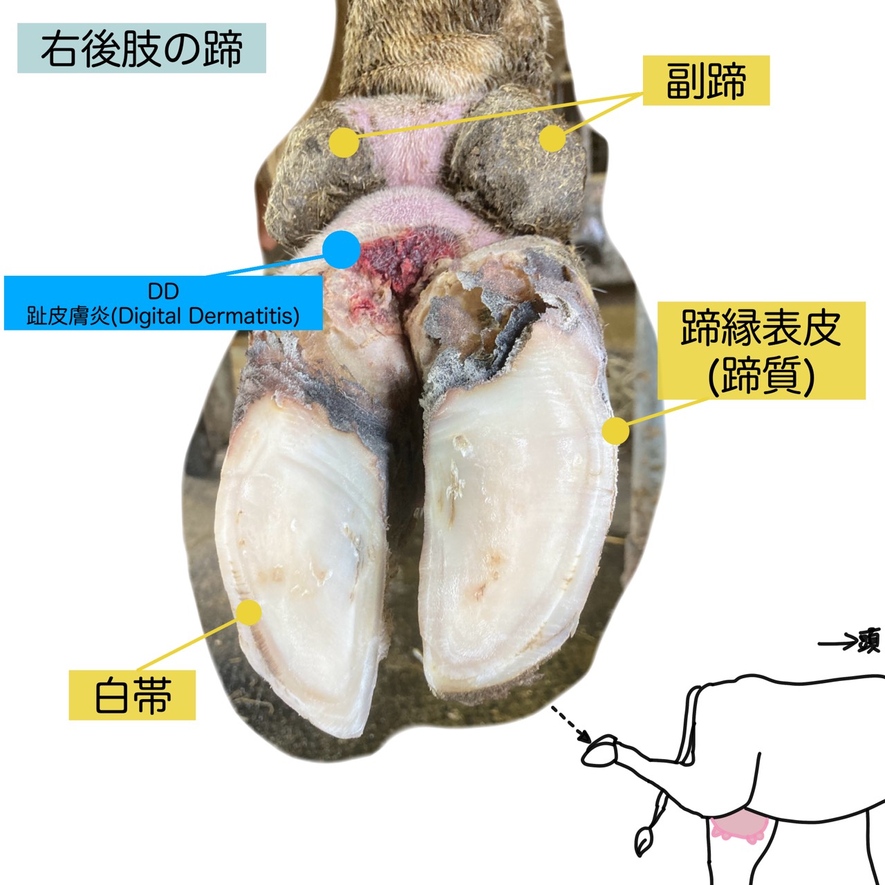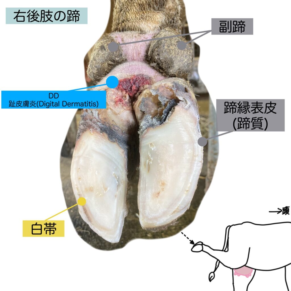 また蹄病には他にもDDというものがあります。これは写真の中にもありますが、蹄球の周辺の皮膚に起こる炎症です。肢皮膚炎ともいいます。