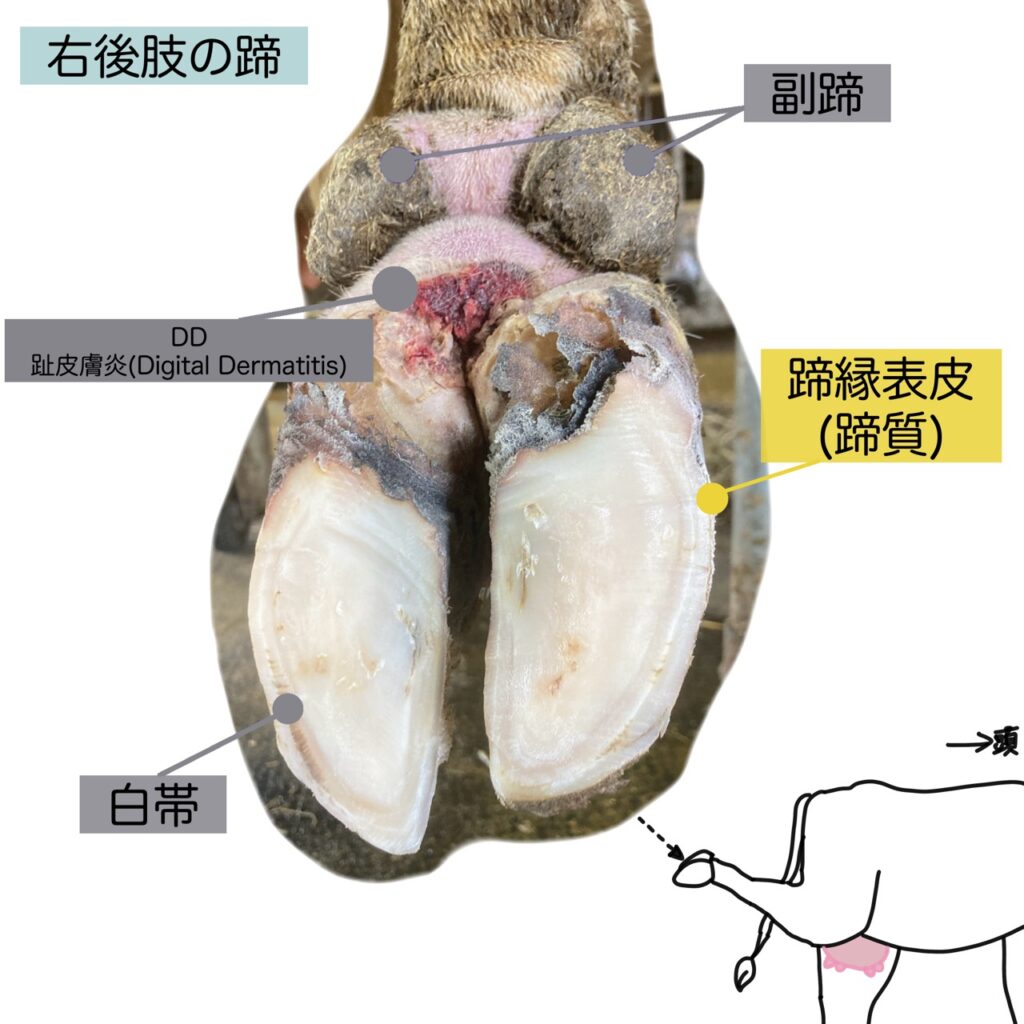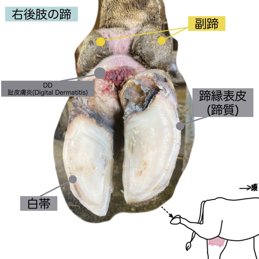 牛には主蹄のほかに、『副蹄表皮』、『副蹄真皮』からなる副蹄があります。