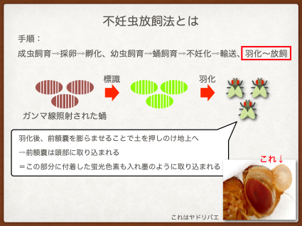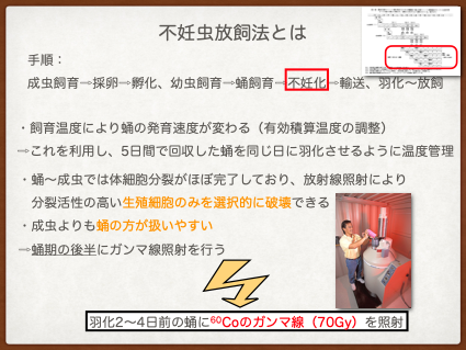 簡単にいうと、メスがほぼ一生に一度しか交尾をしないハエに対して、蛹期の放射線照射によって不妊化したオス成虫を定期的に野生オスより多い数だけ空中からばら撒き、野生メスと交尾させ、子孫を残さないことでハエの数を減らしていくという方法です。