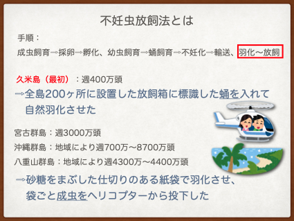 宮古島では現在も再侵入防止のため、定期的に不妊蛹放飼を行なっています。