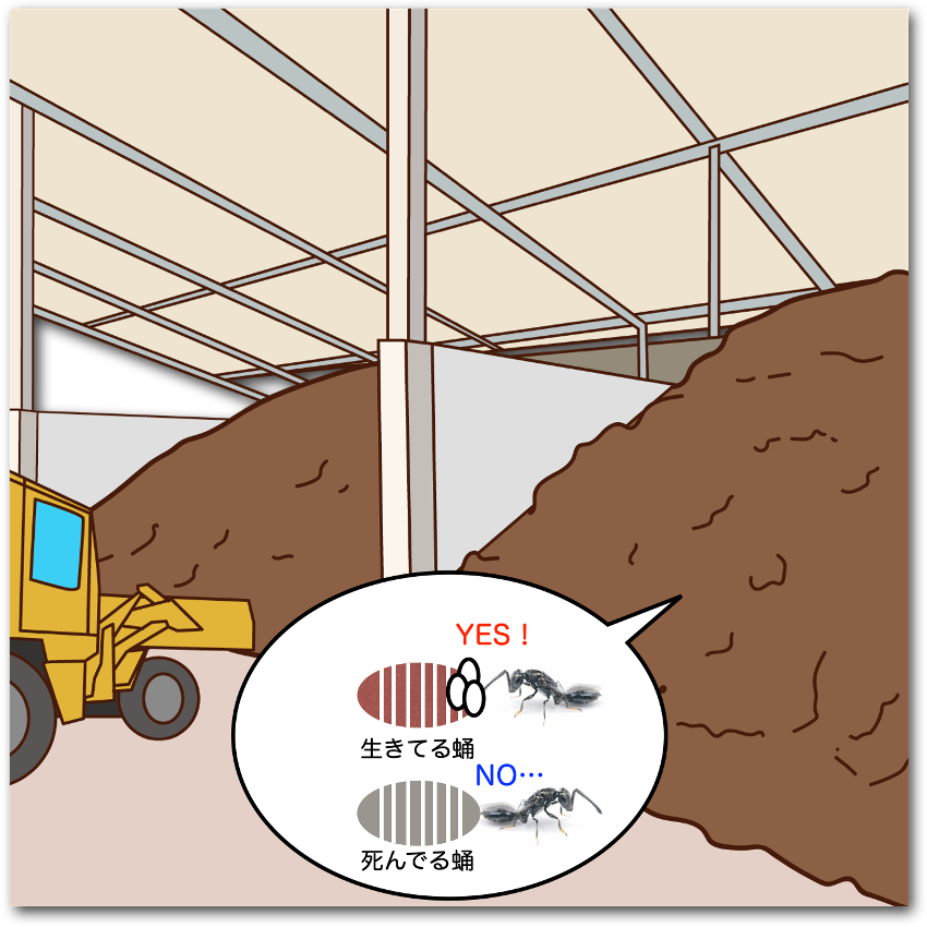 キャメロンのメス成虫は堆肥のにおいに強く誘因され、堆肥に辿り着くと自ら内部に潜り込んでハエの蛹を探し出し、触角で叩いて生きた蛹であることを確認した上で産卵します。こんなに小さいのにとっても賢く優秀ですね!