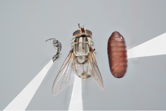 左からキャメロン、サシバエの成虫、サシバエの蛹
