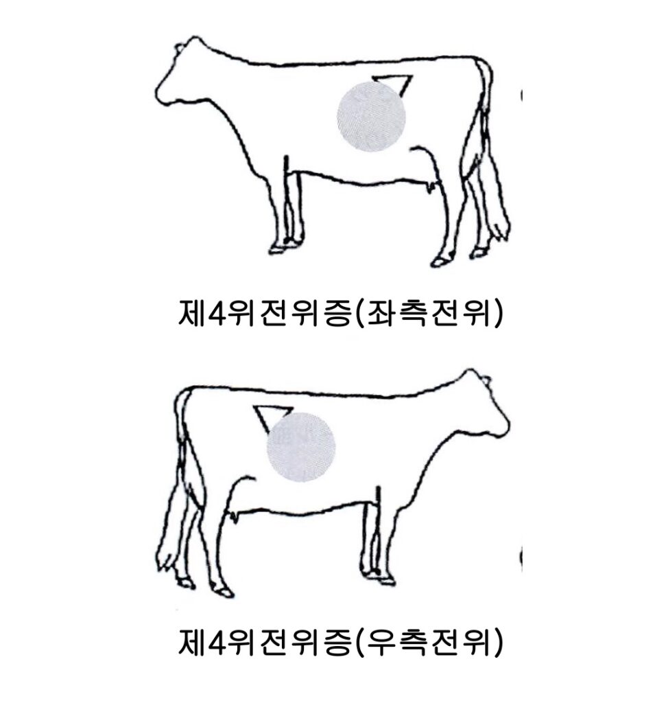 ·분만 2~3주 후에 다발→ 태아가 있던 부위에 공간이 생김+ 분만 후에 사료를 충분히 먹지 못하는 상태(케톤증 등)가 있으면 제1위 (루멘)가 작아지고 더욱 복강 내 공간이 넓어짐 → 제4위가 그 공간에 올라오게 됨.